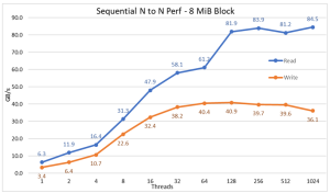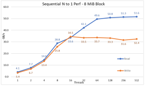 Hiệu suất N máy khách tuần tự cho một tệp chia sẻ duy nhất được đo bằng IOR phiên bản 3.3.0, được hỗ trợ bởi OpenMPI v4.0.1 để chạy điểm chuẩn trên 16 nút điện toán. Các thử nghiệm được thực hiện đa dạng từ một luồng cho đến 512 luồng do không có đủ lõi cho 1024 luồng trở lên. Bài kiểm tra điểm chuẩn này đã sử dụng 8 khối MiB để có hiệu suất tối ưu. Phần kiểm tra hiệu suất trước đó có giải thích đầy đủ hơn về lý do tại sao điều đó lại quan trọng.