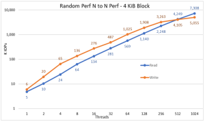 Các thử nghiệm được thực hiện đa dạng từ một luồng cho đến 512 luồng do không có đủ lõi máy khách cho 1024 luồng. Mỗi luồng đang sử dụng một tệp khác nhau và các luồng được chỉ định luân phiên trên các nút máy khách. Bài kiểm tra điểm chuẩn này đã sử dụng 4 khối KiB để mô phỏng lưu lượng khối nhỏ và sử dụng độ sâu hàng đợi là 16. Kết quả từ giải pháp kích thước lớn và khả năng mở rộng dung lượng được so sánh.