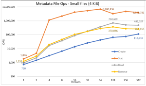 Hiệu suất siêu dữ liệu được đo bằng MDtest phiên bản 3.3.0, được hỗ trợ bởi OpenMPI v4.0.1 để chạy điểm chuẩn trên 16 nút tính toán. Các thử nghiệm được thực hiện đa dạng từ một luồng cho đến 512 luồng. Điểm chuẩn chỉ được sử dụng cho các tệp (không có siêu dữ liệu thư mục), nhận số lần tạo, thống kê, đọc và xóa mà giải pháp có thể xử lý và kết quả tương phản với giải pháp Kích thước lớn.